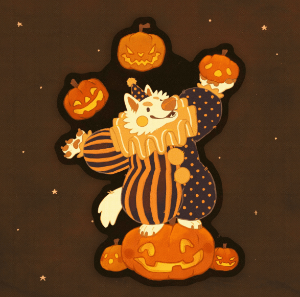 Trick is a clever white dog skilled in magic tricks, his orange and black outfit hiding countless surprises;
